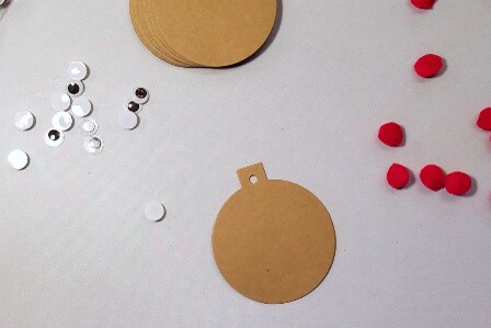 Use su punzón circular para cortar dos círculos de 2 pulgadas de su cartulina blanca, o recórtelos a mano. Corta uno de los círculos por la mitad. Además, corte aproximadamente una tira de 3/4 de pulgada de su papel blanco para usar como borde del gorro de Papá Noel.