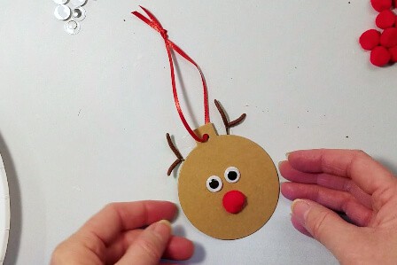 Pegue las astas en la parte posterior del cartón, ate un trozo de cinta roja a la longitud deseada y listo, ¡tendrá su primera etiqueta de regalo Rudolph!