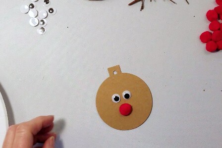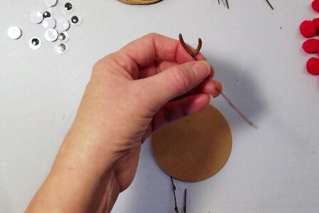 Toma algunas ramitas para usarlas como astas. Juega con la colocación de la nariz roja de pompón y los ojos saltones hasta que tengas un aspecto que te guste. Después de que su pistola de pegamento se caliente, pegue cada uno de ellos en su lugar.
