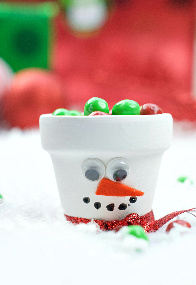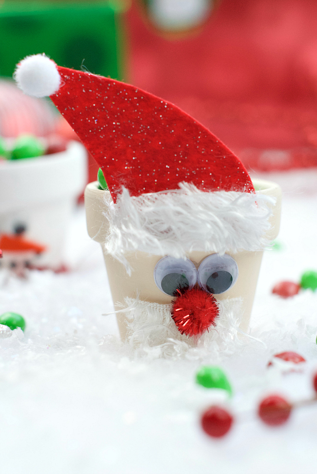 Simplemente comienza pintando la olla y luego dejándola secar. Añadir adornos. Si está usando pegamento caliente, querrá ayudar a los niños para esta parte.
